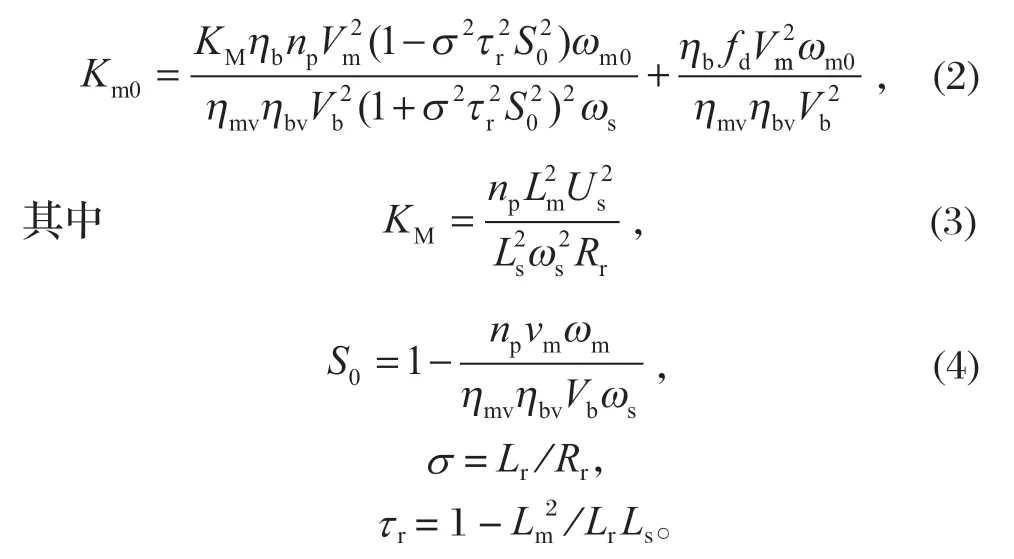 式中:np 為電動機的極對數;Vm 為液壓馬達的排量;ωs 為電網供電頻率;Ls、Lr、Lm 分別為定子電感、轉子電感以及定子與轉子之間的互感;Us 為端電壓。