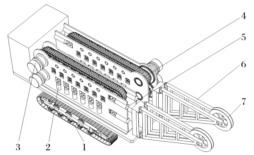 1.履帶行走機構(gòu);2.夾緊氣缸;3.液壓馬達(dá);4.送繩機構(gòu);5.張緊氣缸;6.整車機架;7.導(dǎo)向輪。