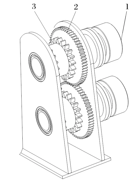 針對雙液壓馬達(dá)在工作過程中出現(xiàn)速度不同步問題,在連接鏈輪的軸上加裝一對同步齒輪,使兩個鏈輪速度強制同步。送繩機構(gòu)的局部結(jié)構(gòu)如圖2所示。